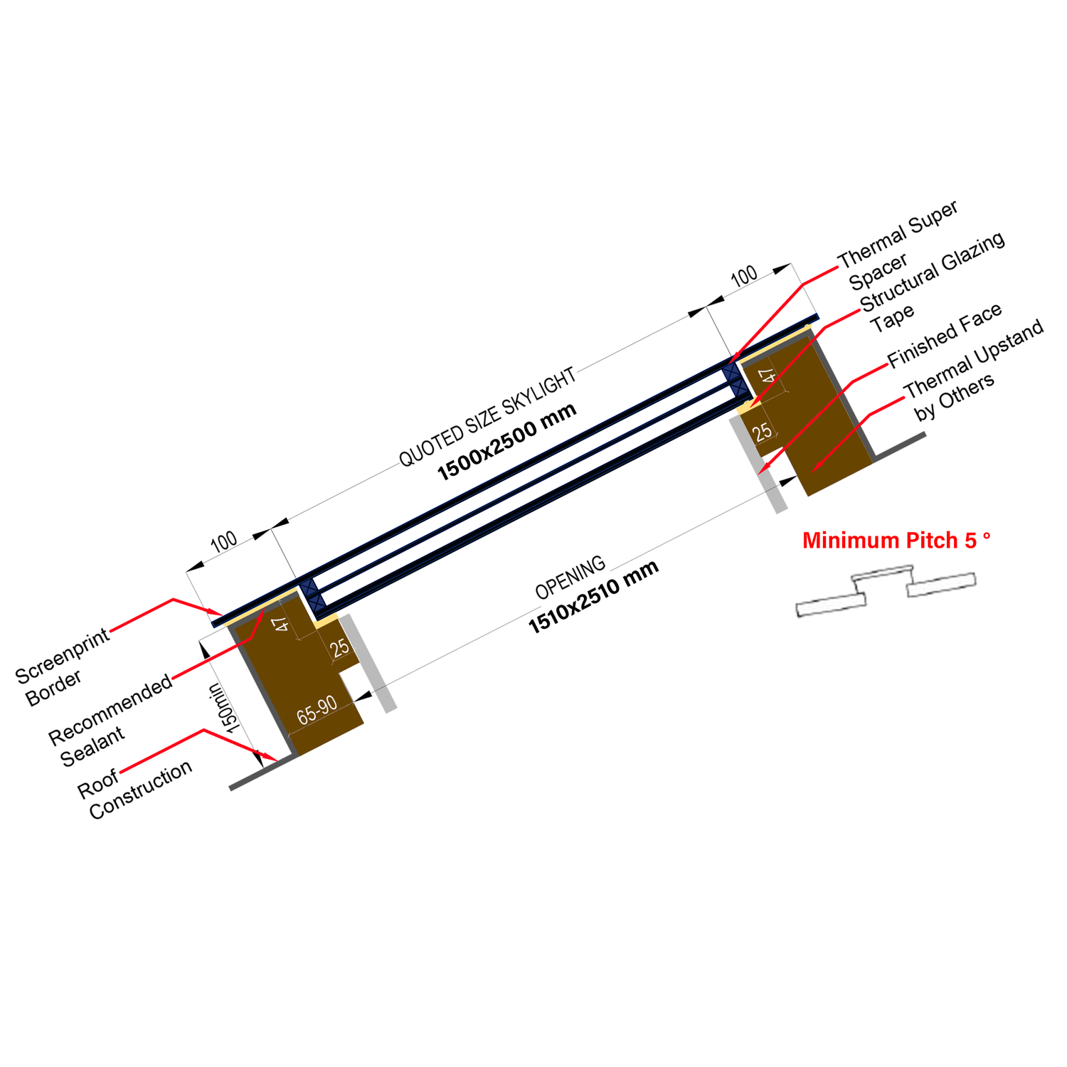 1500 x 2500 mm LD Frameless Triple Glazed Pitched Roof Skylight.